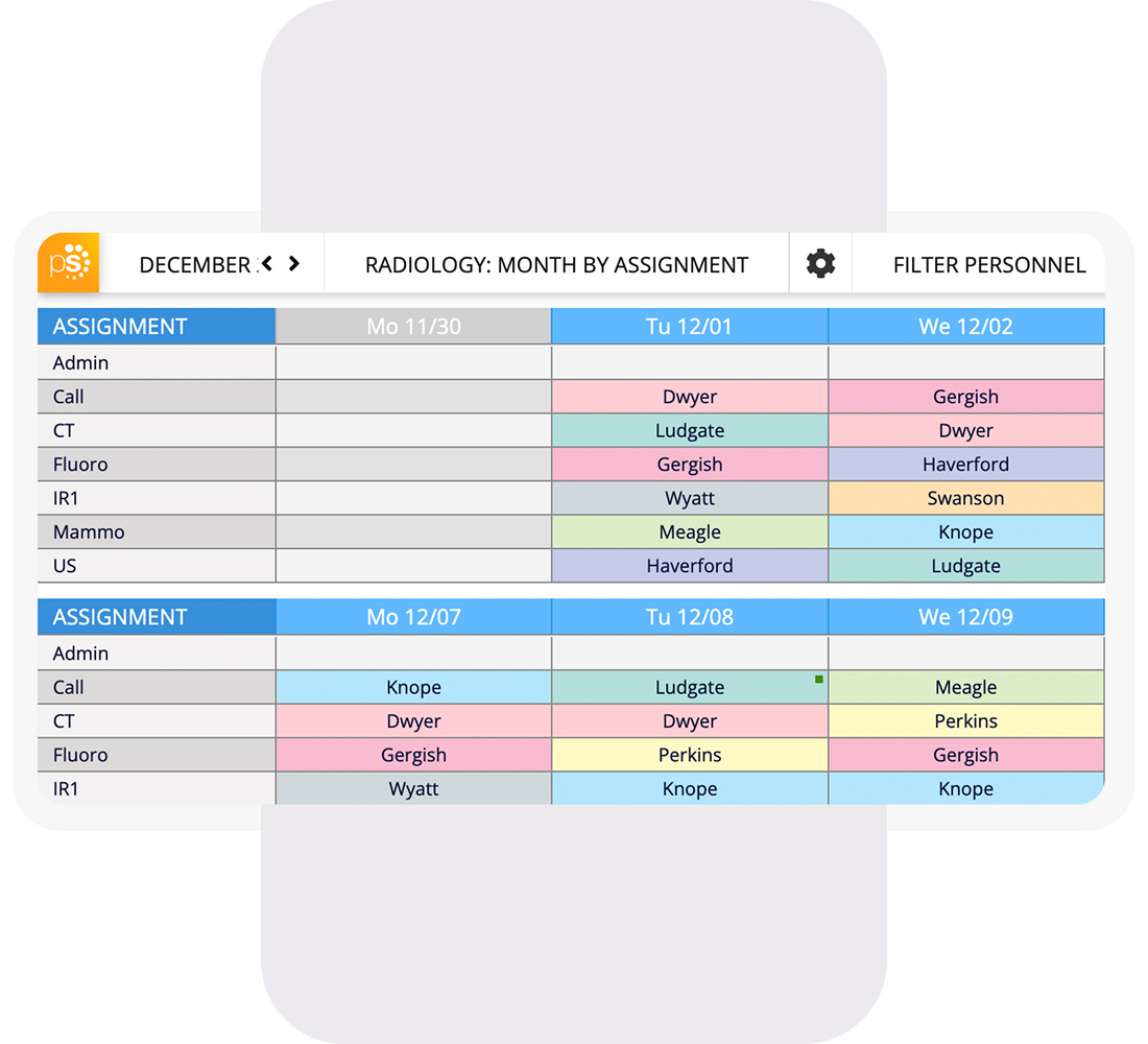Schedule physicians, APPs, techs, and support staff in one system.