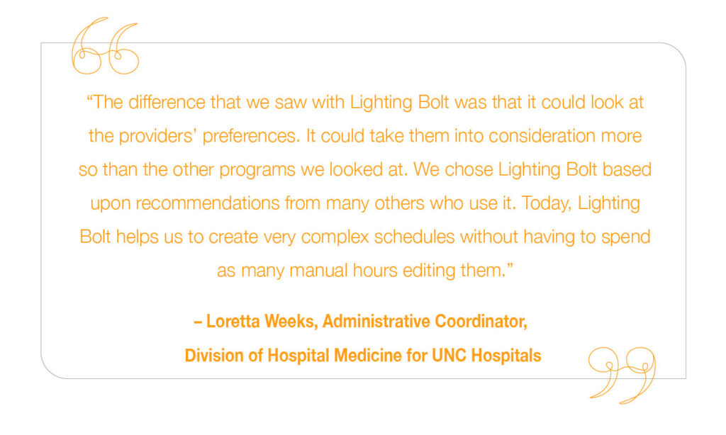 Loretta Weeks, the Administrative Coordinator for the Division of Hospital Medicine for UNC Hospitals, said PerfectServe’s Lightning Bolt Scheduling solution has helped the hospitalist group balance both in-patient and teaching services.