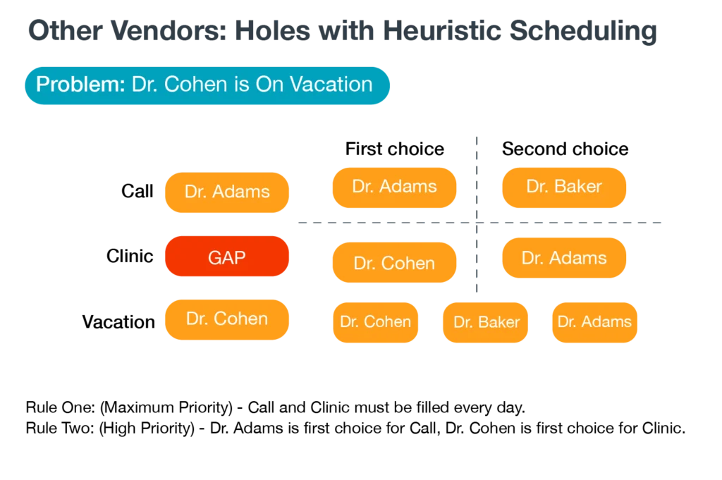 As a scheduler for a small cardiology practice, you’re examining the shift schedule for the Monday night call shift. Dr. Adams is the first choice for the call shift based on his preferences and recent schedules. Dr. Baker is second on the list. For clinic, Dr. Cohen is the first choice, and Dr. Adams is the second choice. After double checking time-off requests, you see that Dr. Cohen requested vacation time. If you used a heuristic scheduling model for this situation, it wouldn’t be possible to meet everybody’s preferences without leaving a gap in clinic coverage. Again, heuristic scheduling finds quick solutions—not always the best solutions.
