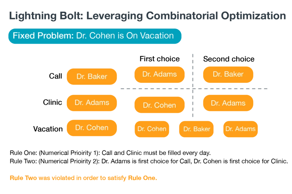 Because Rule One cannot be broken, Lightning Bolt would break Rule Two (the lower-priority rule based on its numerical priority level) to place Dr. Baker in the call shift and Dr. Adams in the clinic shift before granting Dr. Cohen his preferred time off for vacation. This rule breaking system, based on numerical priority levels, is what gives Lightning Bolt’s combinatorial optimization-powered algorithm the ability to produce an optimal schedule every time.