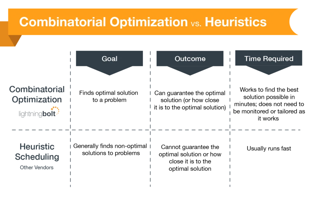 A number of vendors today offer technology that uses heuristics to build schedules. The goal with heuristic scheduling is to find a quick solution that falls within an acceptable range of accuracy without resource conflicts. If you’re coming from a pure paper schedule, that’s an improvement, but that falls short of the goal of combinatorial optimization, which is to find the best solution possible. Here’s a quick comparison of the two methods: